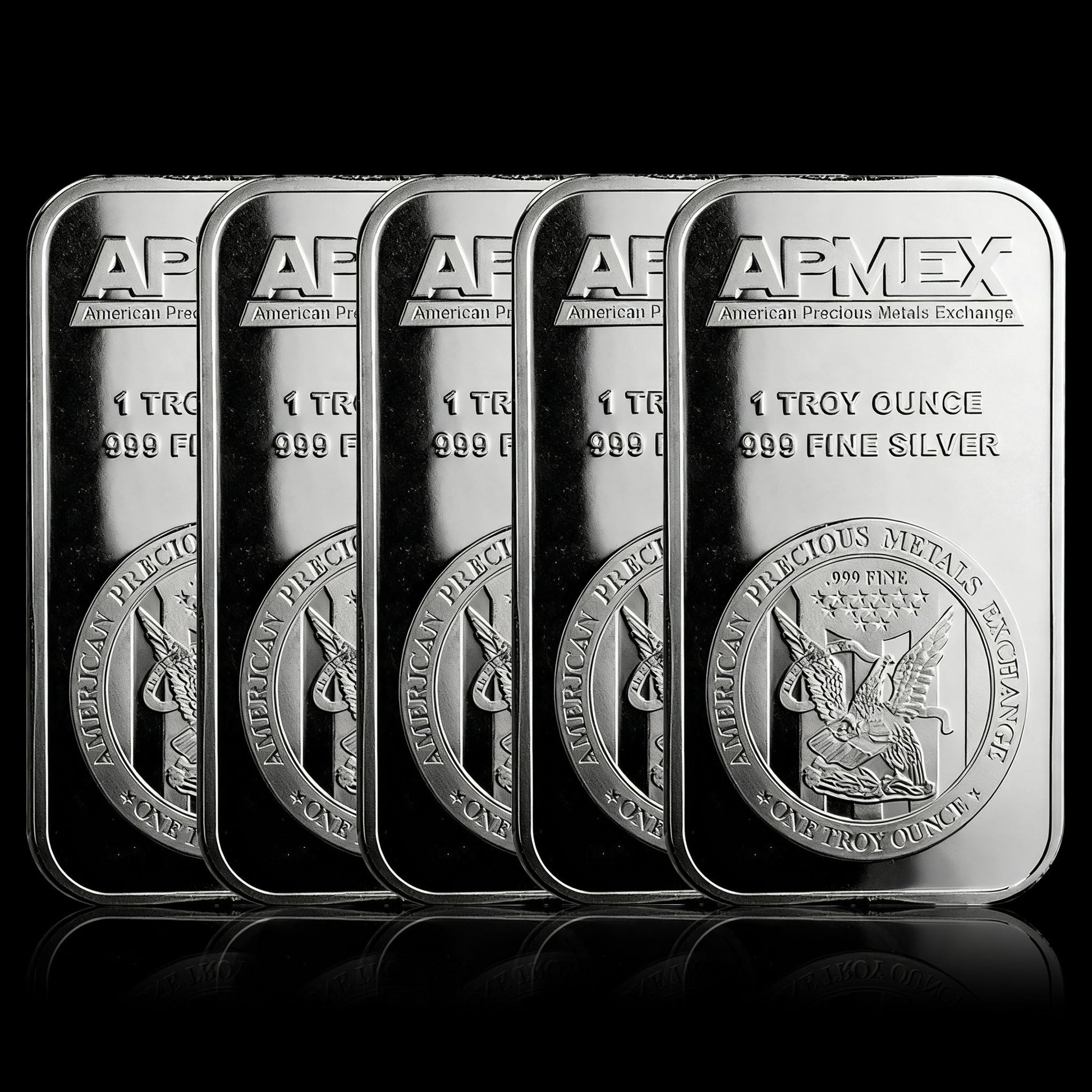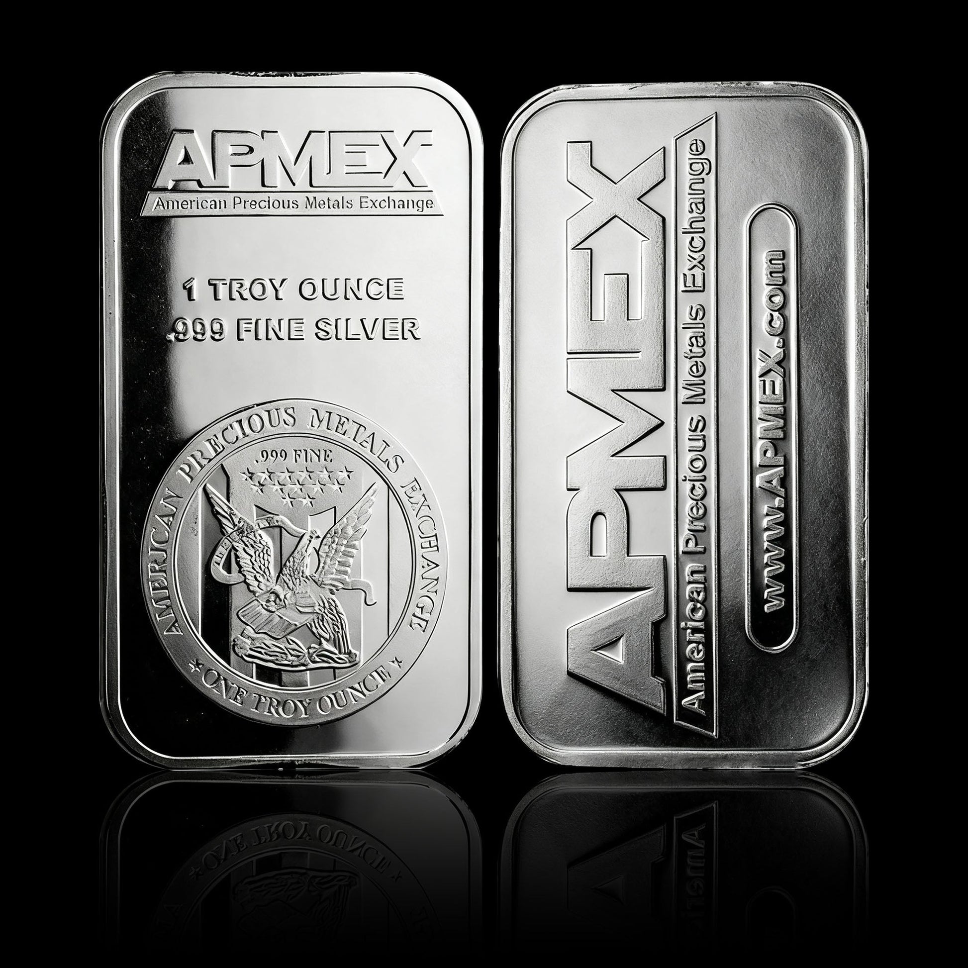The reverse emphasizes APMEX’s brand identity: the bold “APMEX” logo sits at the center, paired with the full brand name “AMERICAN PRECIOUS METALS EXCHANGE” below it. The bar’s official website is inscribed along the top rim, while “1 TROY OUNCE” and “.999 FINE SILVER” reinforce purity and weight at the bottom. The bar’s sides are engraved with repeating “APMEX” lettering and “1 OZ” markings—serving as a subtle anti-counterfeiting feature and instant authenticity check.